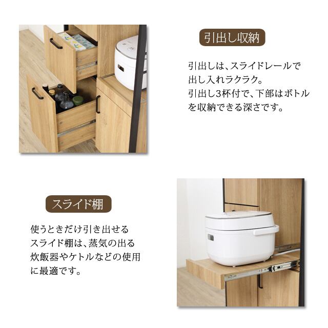 ◆使うときだけ引き出せるスライド棚は、蒸気の出る炊飯器やケトルなどの使用に最適です。