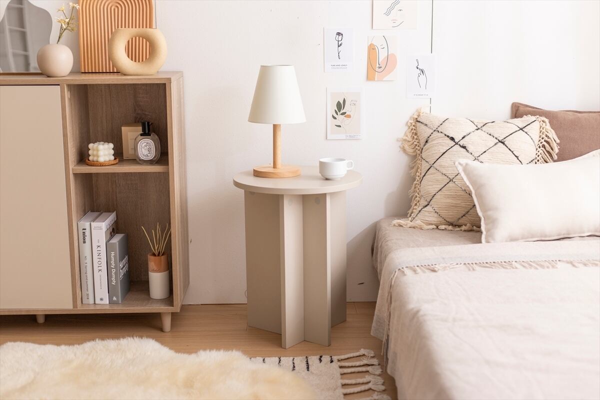 「Luna(ルナ)」は、丸い天板と個性的な脚部がこなれた空間を演出するラウンドサイドテーブルです。シンプルでありながら、存在感のあるデザインが特徴です。幅40cmとコンパクトなサイズなので、リビングやベッドサイド、玄関先など、使い方は自由自在。インテリアコーディネートに新たな風を吹き込みます。